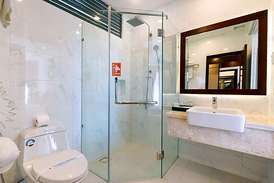 The spacious double room provides air conditioning, a seating area, a terrace with sea views as well as a private bathroom featuring a bath. The unit offers 1 bed.